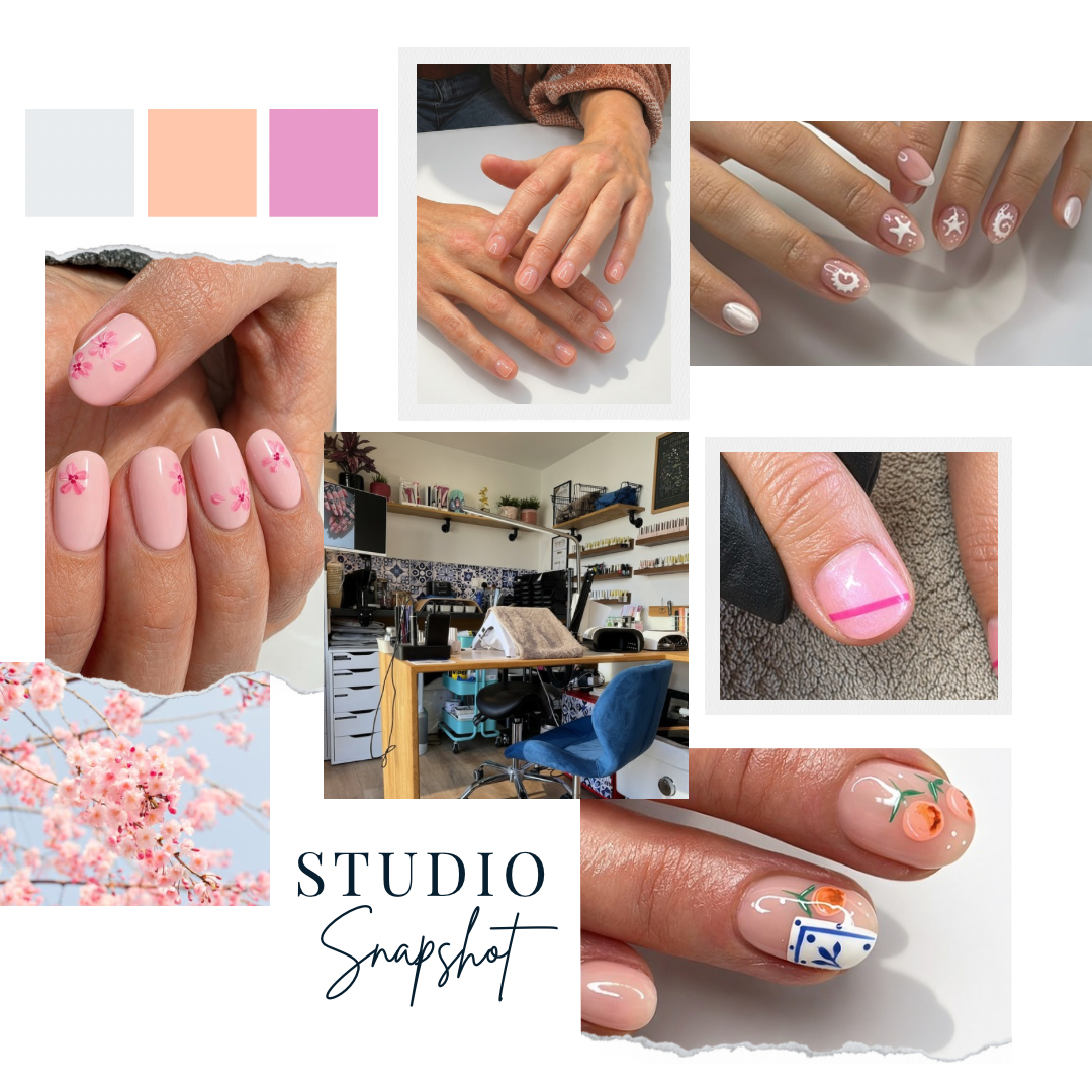 Delicate, detailed designs have stood out this week in the studio. Soft blossom, shells and subtle fruit designs have been popular, alongside minimal cuticle dots and fine line details. Everything has felt light, refined and very wearable.