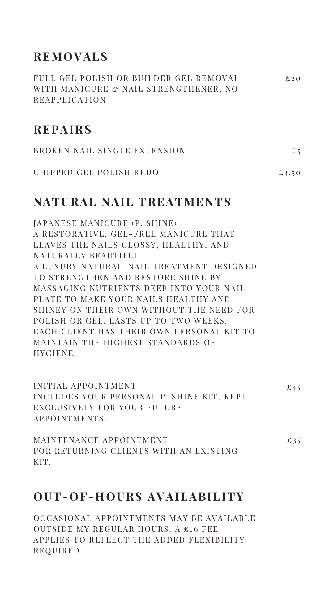 Again this depends on what you book. Prices are listed on the bookings page of the website and saved in an instagram highlight. You will receive an email confirmation on booking which details your service and cost so that you know in advance. Average appointment cost would be between £30 and £57. You can tailor your service to suit your own budget. Any questions please send a message and I can advise.